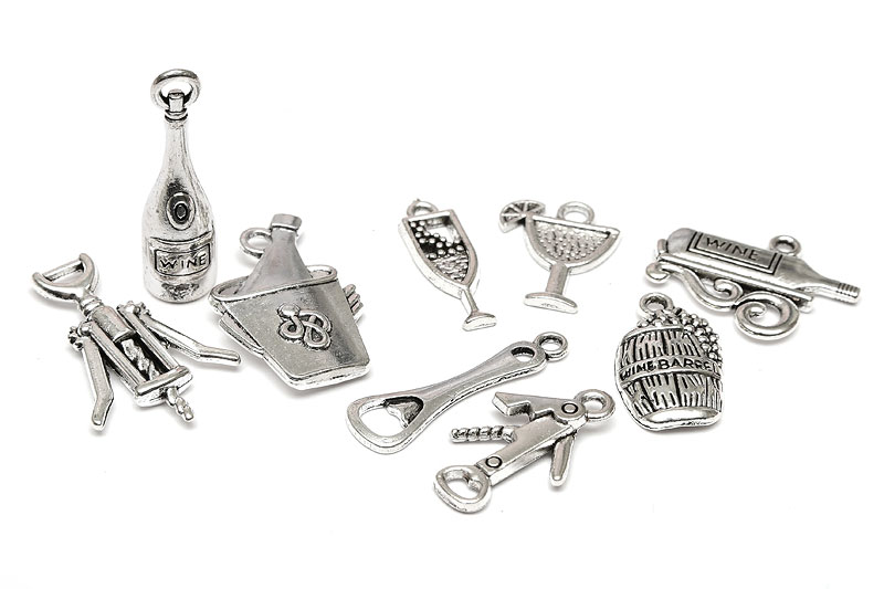 En mix av olika berlocker i temat vin. Det finns vinflaska, vinglas, öppnare mm