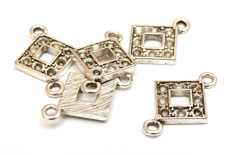 Antiksilver connecter i form av en sneställd kvadrat, en sk. romb, med öglor på två sidor som gör att man kan koppla ihop fler på rad ex.