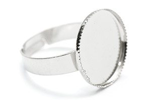 Antiksilver ringstomme med justerbar storlek och en platta med kanter att limma fast en cabochon eller liknande.