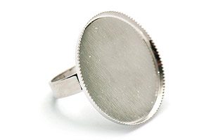 Antiksilver ringstomme med justerbar storlek och en platta med kanter att limma fast en cabochon eller liknande.