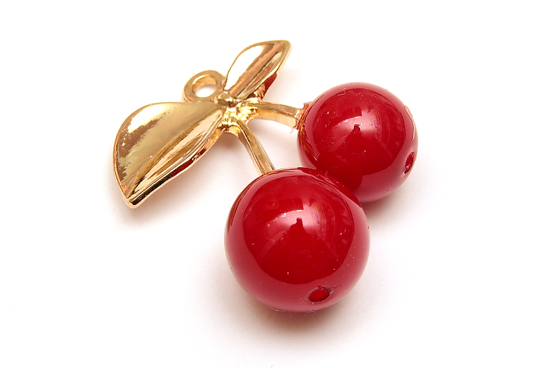 En jättevacker berlock i form av ett verklighetstroget körsbär med röda bär av akryl och blad + stjälk av guldfärgad mässing