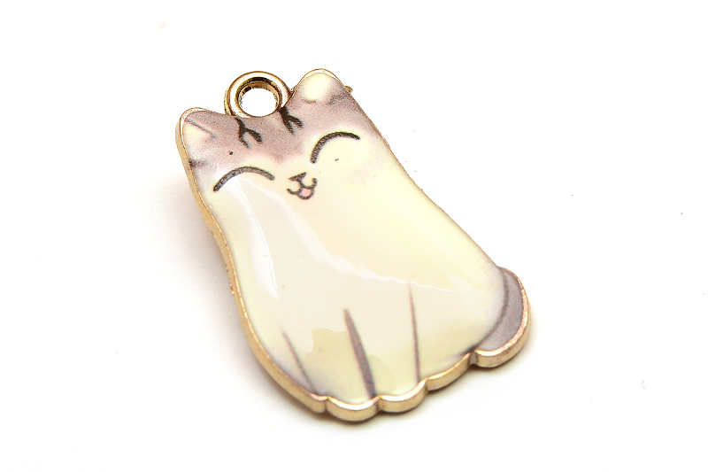 En ljust guldpläterad berlock med färgad katt som liknar rasen ragdoll