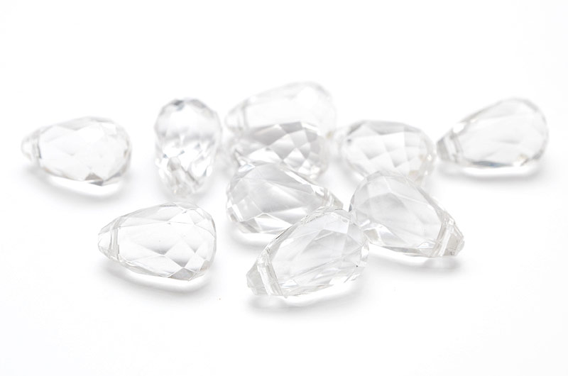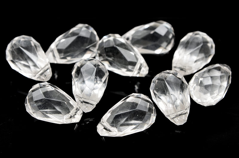Vackert slipade akryldroppar med toppborrat hål, dvs hålet är tvärborrat i den smalaste delen av droppen. Transparent ofärgade.