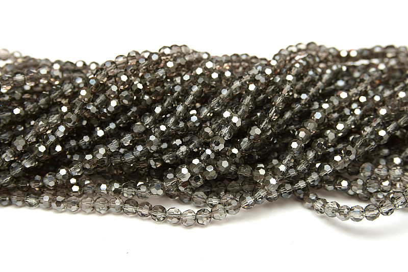 En hel sträng med facettslipade glaspärlor i transparent färg med en del av pärlan som är coated med en metallisk färg som gör att pärlan skimrar extra mycket.