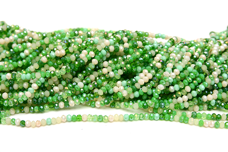 En hel sträng med facettslipade glaspärlor i transparent färg som går i olika gröna toner och creme på en och samma sträng