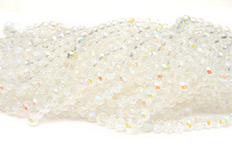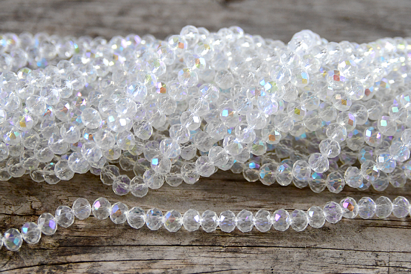 En hel sträng med facettslipade glaspärlor i rondell-form, transparent ofärgad pärla med AB-skimmer (Aurora borealis)