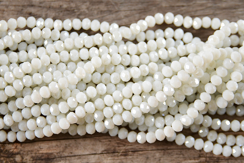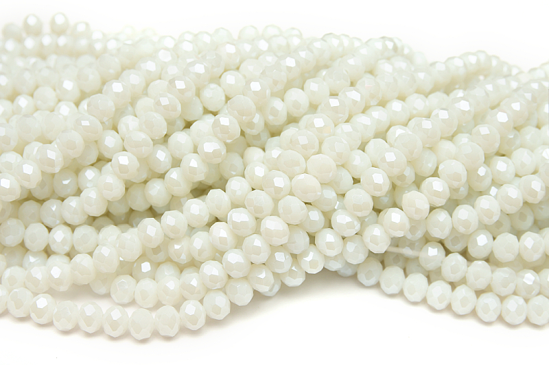 En hel sträng med facettslipade glaspärlor i rondell-form, opak vit färg med lyster