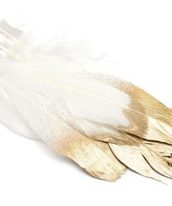 Vita fjädrar med guldfärgad accent i topparna. Färgen sitter olika på varje fjäder och vissa har mer färg än andra.