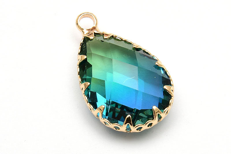 Jag lovar att detta inte är en godisbit med infattning, det är en riktigt vacker infattad glaspärla i en svag grön färg som övergår till en blå färg längst ner. Infattningen är i ljus guld och sitter endast i kanterna vilket innebär att man ser igenom det vackra hänget.