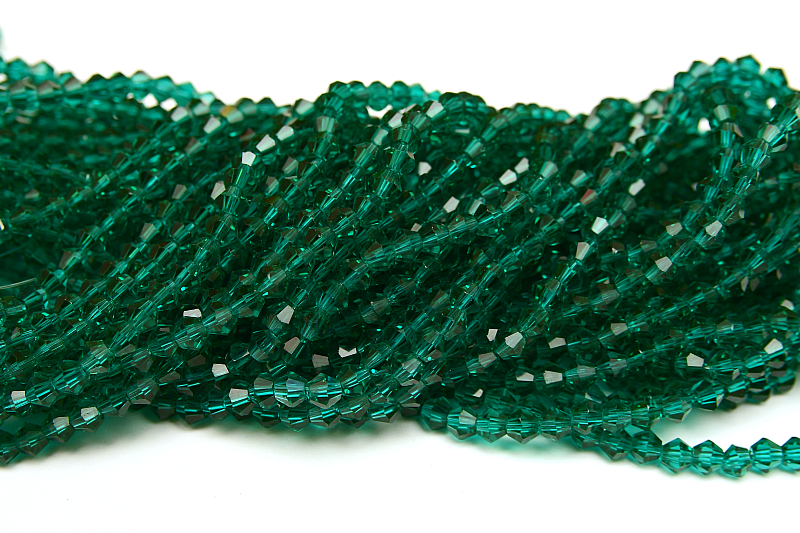 Glasbicones på sträng med en transparent mörkgrön färg. Slipade för att gnistra vackert som kristaller