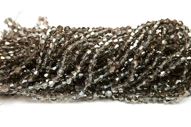 Glasbicones på sträng med en transparent färg och en silverglänsande hinna. Slipade för att gnistra vackert som kristaller