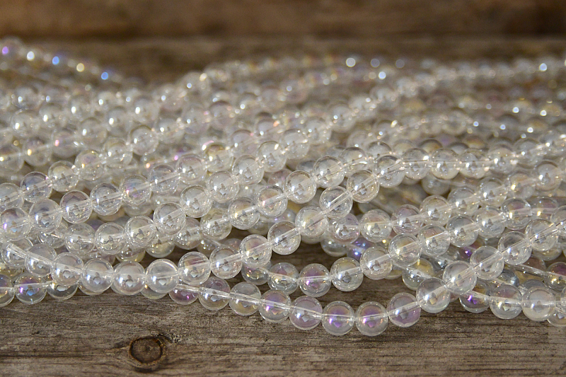 Runda glaspärlor i transparent utförande med ett vackert flerfärgat skimmer.