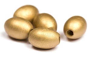 Ovala släta träpärlor med guld-finish. Stora hål.